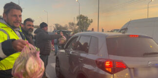 Τρόφιμα στους διερχόμενους οδηγούς από τη λεωφόρο Γεωργικής Σχολής, στο ύψος του αγροτικού μπλόκου στα «Πράσινα Φανάρια», στην ανατολική Θεσσαλονίκη, μοίρασαν το απόγευμα της...