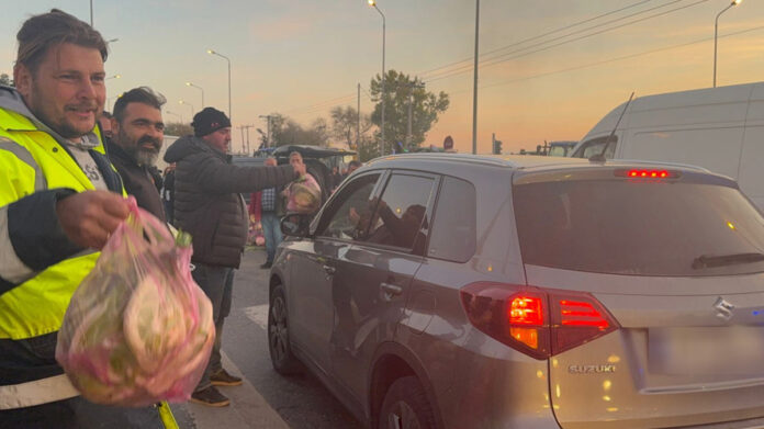Τρόφιμα στους διερχόμενους οδηγούς από τη λεωφόρο Γεωργικής Σχολής, στο ύψος του αγροτικού μπλόκου στα «Πράσινα Φανάρια», στην ανατολική Θεσσαλονίκη, μοίρασαν το απόγευμα της Πέμπτης παραγωγοί από τις λαϊκές αγορές.