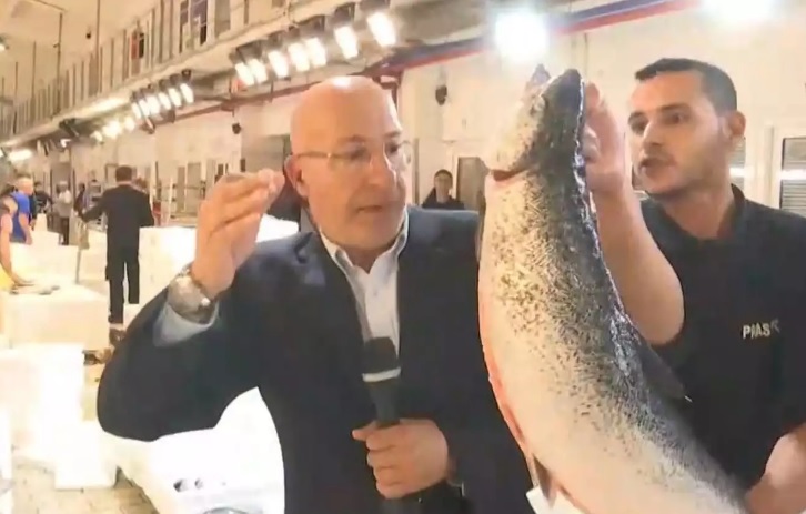 Δείχνοντας λοιπόν τα ψάρια, ο Γιώργος Τσελίκας δεν δίστασε να “μαλώσει” χαριτολογώντας έναν έμπορο, ο οποίος πήγε δίπλα του για να δείξει ένα μεγάλο ψάρι στην κάμερα.