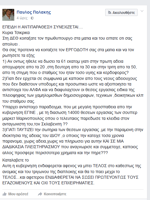 Συνεχίζει την αντιπαράθεσή του με την δημοσιογράφο του Alpha, Ευαγγελία Τσικρίκα, o αναπληρωτής υπουργός Υγείας, Παύλος Πολάκης, με νέα του ανάρτηση στον προσωπικό του λογαριασμό στο Facebook.