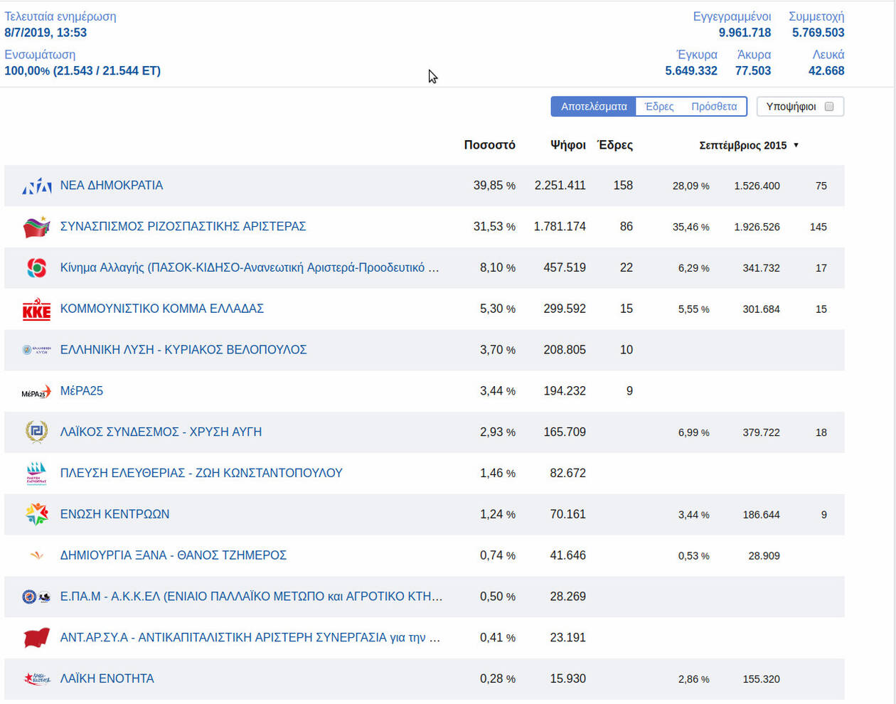 Μητέρα των μαχών ήταν φυσικά η εκλογική αναμέτρηση της 7ης Ιουλίου. Μεγάλος νικητής ήταν η Νέα Δημοκρατία που συγκέντρωσε 39,85% αναδεικνύοντας τον Κυριάκο Μητσοτάκη νέο πρωθυπουργό της χώρας και μάλιστα με μεγάλη διαφορά από τον δεύτερο ΣΥΡΙΖΑ. Ωστόσο, το κόμμα του Αλέξη Τσίπρα κατάφερε να εδραιωθεί ως δεύτερη δύναμη του Κοινοβουλίου με ποσοστό που έφτασε το 31,53%.