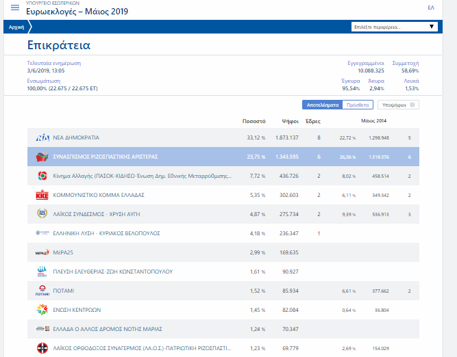 Μεγάλος νικητής και σε αυτές τις κάλπες ήταν η Νέα Δημοκρατία καθώς τα ποσοστά της έφθασαν το 33,12%, ενώ του ΣΥΡΙΖΑ το 23,75%. Ακολούθησαν το ΚΙΝΑΛ με 7,72%, το ΚΚΕ 5,35%, ο Λαϊκός Σύνδεσμος – Χρυσή Αυγή 4,87% και η Ελληνική Λύση 4,18%. Σημειώνεται ότι μεγάλη «μάχη» για έναν εκπρόσωπο στις Βρυξέλλες έδωσε μέχρι και την τελευταία και το ΜέΡΑ 25, που εν τέλει έμεινε εκτός ευρωπαϊκού κοινοβουλίου καθώς το ποσοστό του έφθασε το 2,99%.