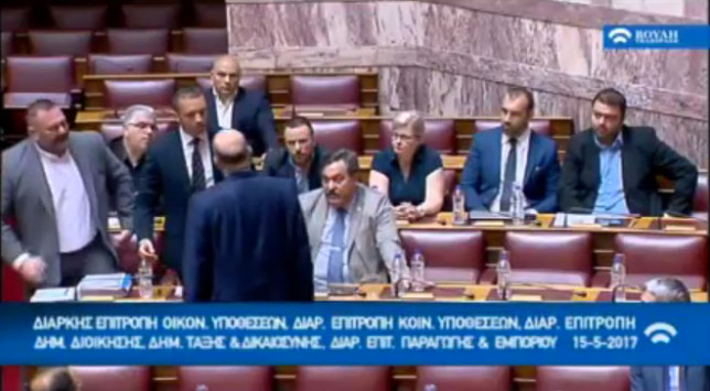 Τη στιγμή εκείνη ο σκηνοθέτης άλλαξε πλάνο με βουλευτές που βρίσκονταν στην αίθουσα να καταγγέλλουν ότι ο Ηλίας Κασιδιάρης απώθησε βίαια τον βουλευτή της ΝΔ. Οι υπόλοιποι χρυσαυγίτες τον «έλουσαν» με μπουκάλια με νερό, με τουλάχιστον δύο εξ αυτών, τον Γιάννη Λαγό και τον Χρήστο Παππά να κινούνται απειλητικά προς το μέρος του κ. Δένδια. Μάλιστα, νωρίτερα, ακούγονται στο βίντεο να λένε «πήγαινε από εδώ ρε» ο Χρήστος Παππάς, και «έλα, έλα πήγαινε από εδώ» ο Γιάννης Λαγός.