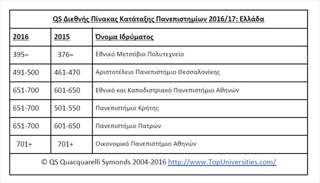 Πτώση κατέγραψαν πέντε από τα έξι πανεπιστήμια που βρίσκονται στον διεθνή πίνακα κατάταξης της QS 2016 -2017, με το Εθνικό Μετσόβιο Πολυτεχνείο να παραμένει το πρώτο ελληνικό πανεπιστήμιο που βρίσκεται πιο ψηλά στην κατάταξη, ανάμεσα στα 400 καλύτερα παγκοσμίως, ωστόσο, σημειώνει πτώση 19 θέσεων και βρίσκεται στην 395η θέση.
