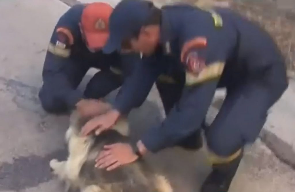 Όπως φαίνεται στο βίντεο του Action24, οι πυροσβέστες τραβούν το σκυλάκι από το λουρί, προκειμένου να το απομακρύνουν από τη φωτιά. Αυτό, φοβισμένο με τα όσα συμβαίνουν γύρω του, προέβαλε αντίσταση και έτσι οι πυροσβέστες σταματούν και το χαϊδεύουν, προκειμένου να προχωρήσει μαζί τους και να οδηγηθεί σε ασφαλές σημείο.