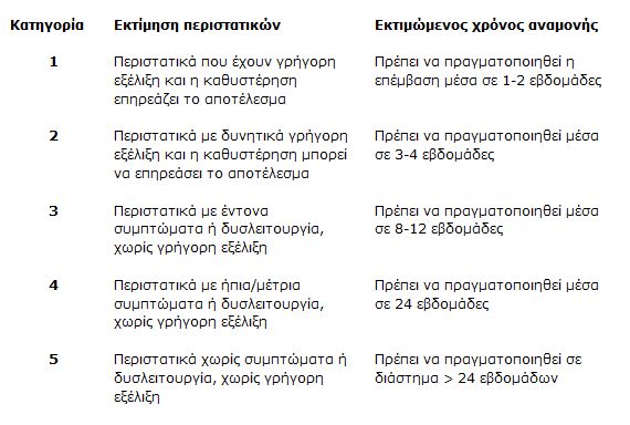 Πίνακας κατηγοριών των χειρουργικών επεμβάσεων, με βάση την εκτιμώμενη δυνατότητα χρόνου αναμονής: