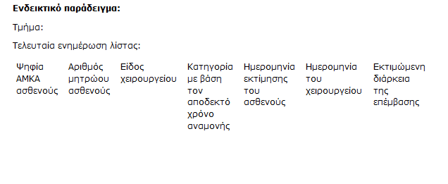Σε κάθε ιστότοπο θα πρέπει να παρουσιάζεται ο παραπάνω πίνακας των κατηγοριών των χειρουργικών επεμβάσεων, με βάση την εκτιμώμενη δυνατότητα χρόνου αναμονής, ώστε να γίνεται κατανοητή η κατηγορία στην οποία εντάσσεται κάθε περιστατικό.