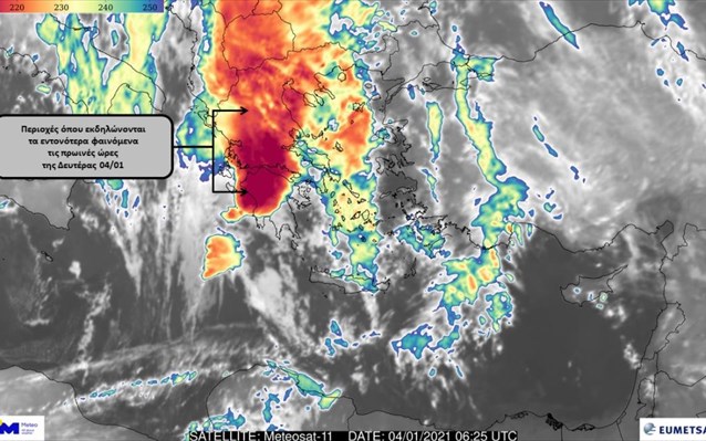 Σύμφωνα με τα διαθέσιμα προγνωστικά στοιχεία του Εθνικού Αστεροσκοπείου Αθηνών / Meteo.gr, το ψυχρό μέτωπο θα σαρώσει τη χώρα μας από τα δυτικά προς τα ανατολικά κατά τη διάρκεια της μέρας, προκαλώντας κατά τόπους ισχυρές καταιγίδες και πρόσκαιρα θυελλώδεις ανέμους στα πελάγη. Πυκνές χιονοπτώσεις θα σημειωθούν στα δυτικά και βόρεια ορεινά τμήματα.