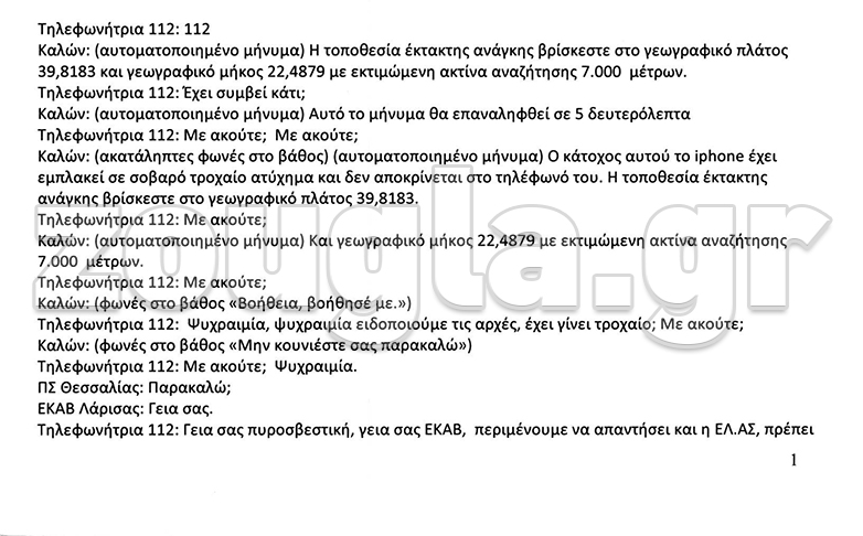 Ακολουθεί η συνομιλία της τηλεφωνήτριας του 112 με τον αντίστοιχο υπάλληλο στην ΕΛΑΣ Λάρισας τον οποίο κατατοπίζει για το στίγμα και τα λοιπά τεκταινόμενα.