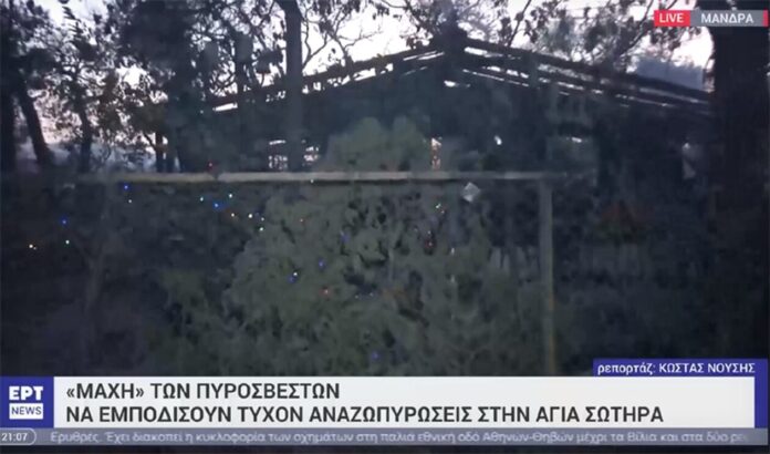 Η κάμερα της ΕΡΤ βρέθηκε στην περιοχή και μεταδίδει την εικόνα ενός σπιτιού με χριστουγεννιάτικα φωτάκια που παραδόθηκε στις φλόγες.