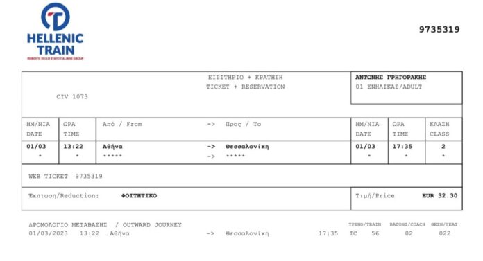 Σύμφωνα με ανάρτηση της μητέρας του στο facebook, ο φοιτητές δεν έβγαλε εισιτήριο με το τρένο που συγκρούστηκε με την εμπορική αμαξοστοιχία στα Τέμπη επειδή του το ζήτησαν οι γονείς του.