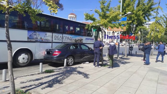 Σύμφωνα με τις πληροφορίες του ThessToday.gr ένα πούλμαν συγκρούστηκε με επιβατικό ΙΧ, με αποτέλεσμα μάλιστα ο οδηγός του τελευταίου να εκτραπεί της πορείας του και να καβαλήσει τα πασαλάκια μπροστά από το Αρχαιολογικό Μουσείο.