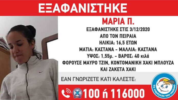 Σύμφωνα με το Χαμόγελο του Παιδιού στις 3/12/2020, στις 16:30 ώρα, εξαφανίστηκε από το σπίτι της στον Πειραιά, η Μαρία (ον.) Π. (επ.) 16,5 ετών.