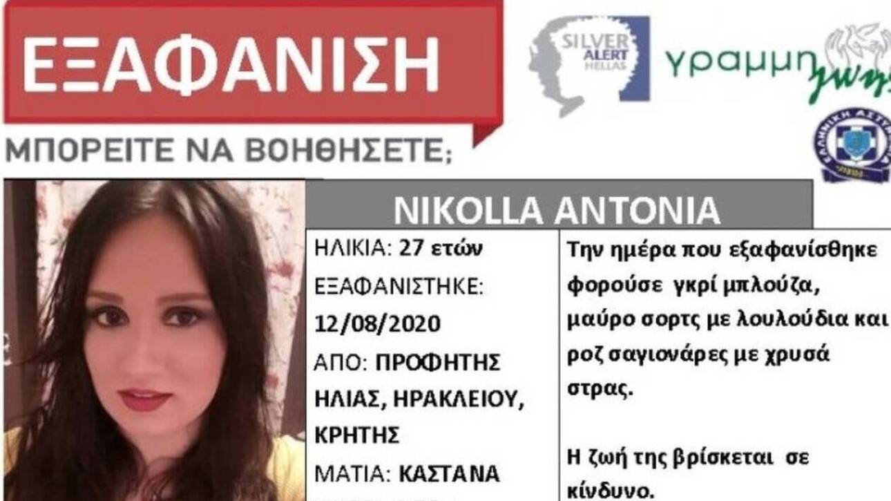 Ειδικότερα, πρόκειται για την Αntonia Nikolla, η οποία, όπως έγινε γνωστό, χάθηκε στις 12 Αυγούστου και την ημέρα που εξαφανίστηκε φορουσε γκρι μπλούζα, μαύρο σορτς με λουλούδια και ροζ σαγιονάρες.