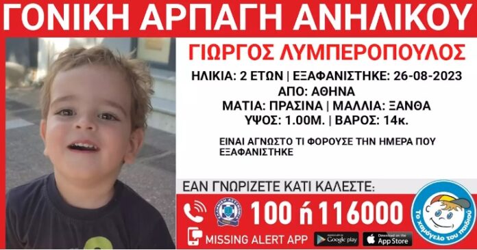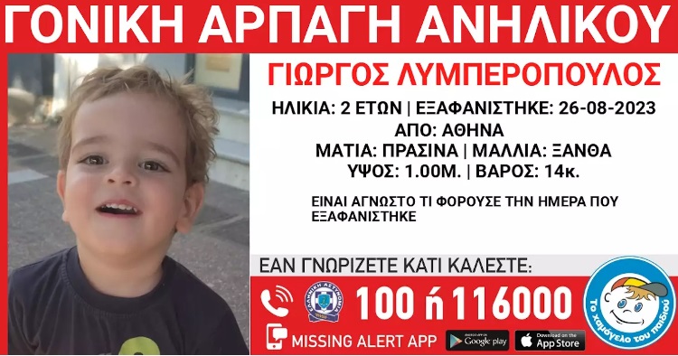 Συνεχίζονται οι έρευνες για τον 2χρονο Γιώργο Λυμπερόπουλο, ο ανήλικος πού έπεσε θύμα γονικής αρπαγής, σύμφωνα με το Χαμόγελο του Παιδιού, ωστόσο λόγω της συμπλήρωσης των 48 ωρών πραγματοποιείται λήξη του Αmber Αlert.