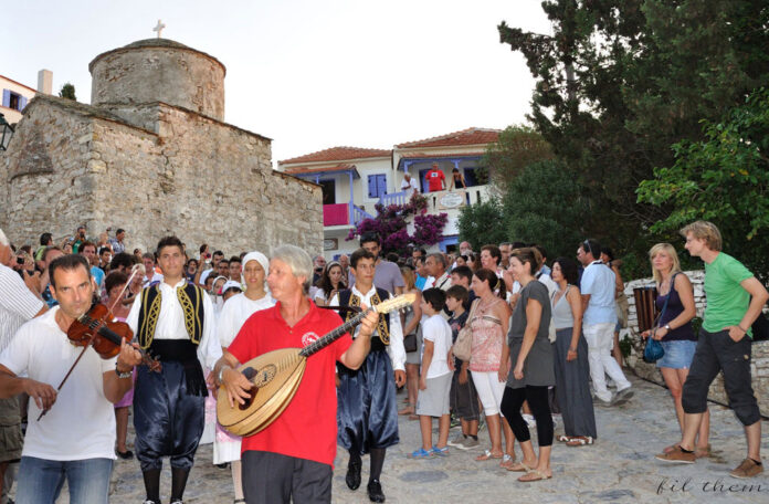 Κάθε πανηγύρι έχει το δικό του παραδοσιακό πιάτο, και όλα τα νοικοκυριά είναι ανοιχτά τόσο για τους ντόπιους όσο και για τους ξένους, οι οποίοι δοκιμάζουν τα προσφερόμενα τοπικά εδέσματα και το κρασί που ρέει άφθονο. Το νησί αποτελεί δημοφιλή προορισμό κατά τους εορτασμούς της Κοιμήσεως της Θεοτόκου όπου κατακλύζεται από πλήθος προσκυνητών από όλη την Ελλάδα. Οι εορτασμοί ξεκινούν την παραμονή, 14 Αυγούστου, με τον πανηγυρικό εσπερινό. Το επόμενο πρωί, μετά τον όρθο και την αρχιερατική λειτουργία στον Ιερό Ναό της Ευαγγελίστριας, ακολουθεί λιτανεία της θαυματουργού Εικόνας με την παρουσία επίσημων φορέων, του πολεμικού ναυτικού και εκατοντάδων πιστών.