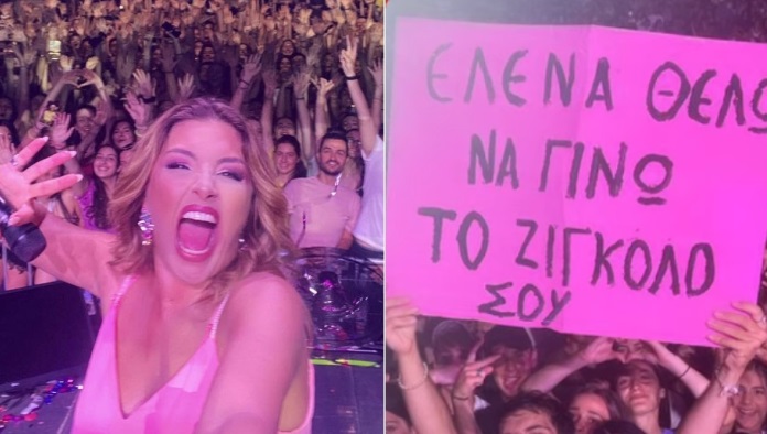 «Έλενα θέλω να γίνω το ζιγκολό σου» γράφει το «πανό» του αγοριού που πήγε να ακούσει την αγαπημένη του καλλιτέχνιδα από κοντά, κάνοντας αναφορά σε ένα από τα πιο γνωστά τραγούδια της