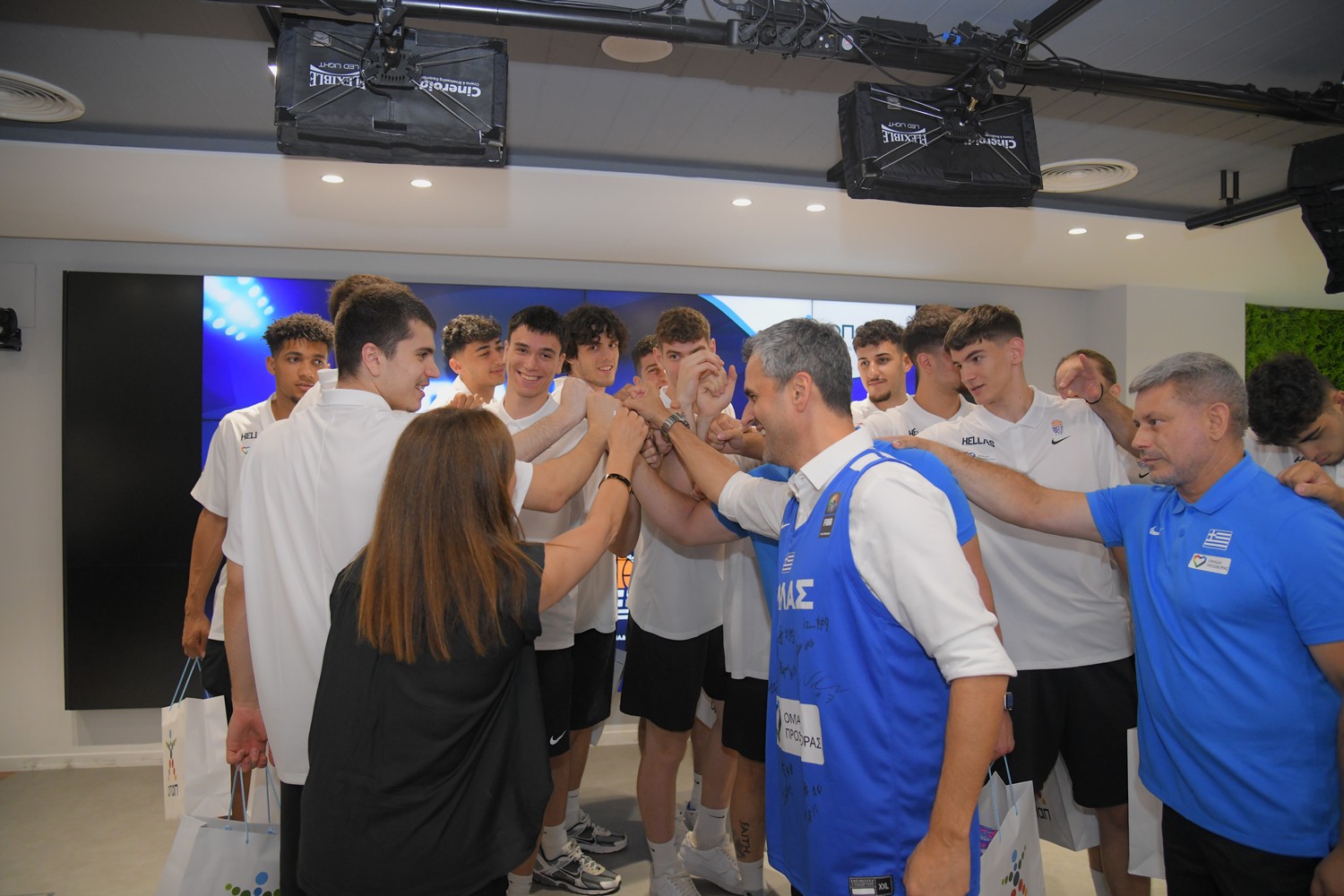 Αποθεωτική υποδοχή επεφύλασσαν οι εργαζόμενοι του ΟΠΑΠ στα μέλη της Εθνικής Ομάδας Μπάσκετ U20 και τους ευχήθηκαν καλή επιτυχία στην προσπάθειά τους για διάκριση στο Ευρωπαϊκό Πρωτάθλημα Μπάσκετ Νέων Ανδρών.