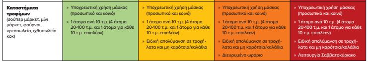 Επίσης, στο επίπεδα 4 («αυξημένου κινδύνου», κόκκινο), προβλέπεται λειτουργία των καταστημάτων της κατηγορίας και το Σαββατοκύριακο.