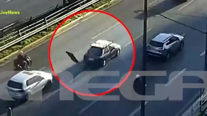 Την στιγμή που μία τηλεόραση εκσφενδονίζεται από σχάρα αυτοκινήτου στη λεωφόρο Συγγρού, κατέγραψε κάμερα.