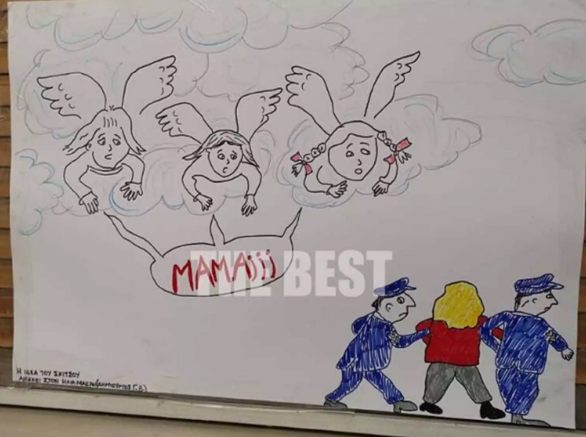 Μαλένα, Ίριδα και Τζωρτζίνα με τη μορφή τριών αγγέλων κοιτούν τη μαμά τους, που προσάγεται από αστυνομικούς. Το ανατριχιαστικό σκίτσο που κολλήθηκε πάνω στο παιδικό παράθυρο, έξω από το σπίτι της οικογένειας Δασκαλάκη στην Πάτρα σοκάρει και προκαλεί ερωτηματικά!