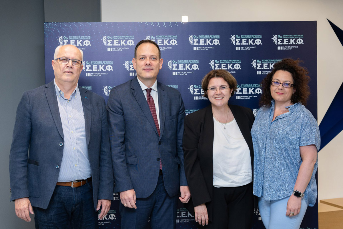 Το Μητροπολιτικό Κολλέγιο διοργάνωσε, για 9η χρονιά, το Συμπόσιο Έρευνας και Καινοτομίας Φοιτητών (Σ.Ε.Κ.Φ.) με θέμα «Έρευνα-Καινοτομία-Επιχειρηματικότητα: Ο ρόλος των Πανεπιστημίων στο οικοσύστημα καινοτομίας». Όπως κάθε χρόνο, ο δημοφιλής θεσμός, που πραγματοποιήθηκε στο Campus Θεσσαλονίκης (και μεταδόθηκε σε όλα τα Campuses του Κολλεγίου και στο ευρύτερο κοινό μέσω live streaming), υπό την αιγίδα της Περιφέρειας Κεντρικής Μακεδονίας, έδωσε την ευκαιρία σε φοιτητές/τριες και αποφοίτους του Κολλεγίου να παρουσιάσουν ερευνητικά έργα και καινοτόμες ιδέες – αναδεικνύοντας τον ρόλο της έρευνας και της καινοτομίας στην προσωπική και επαγγελματική ανάπτυξη της νέας γενιάς, αλλά και την πρόοδο της επιστήμης και της κοινωνίας.