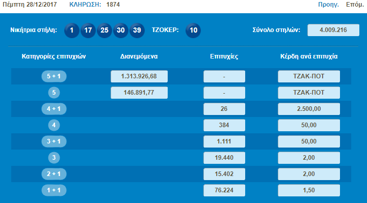 Οι τυχεροί αριθμοί οι οποίοι κληρώθηκαν στην αποψινή κλήρωση είναι οι εξής: