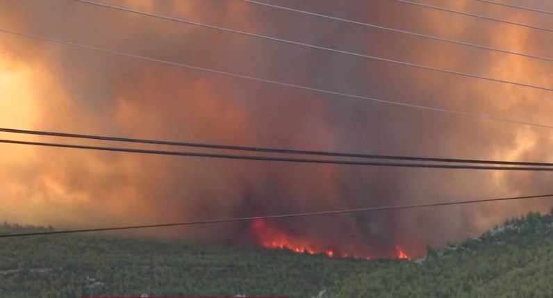 Όπως μπορείτε να δείτε, η φωτιά στα Βίλια καίει σε δάσος με τους ισχυρούς ανέμους να δυσκολεύουν τις προσπάθειες των πυροσβεστών.