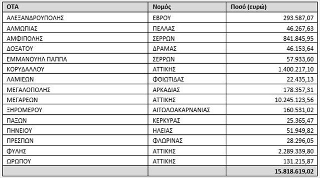 Επιχορηγήσεις συνολικού ποσού 15.818.619,02 ευρώ σε δήμους της χώρας ενέκρινε το υπουργείο Εσωτερικών, αποκλειστικά και μόνο για την εξόφληση υποχρεώσεών τους που προέρχονται από δικαστικές αποφάσεις και διαταγές πληρωμής που έχουν καταστεί τελεσίδικες έως 19/7/2018 και αφορούν σε αξιώσεις από προμήθειες αγαθών ή παροχή υπηρεσιών ή εκτέλεση έργων.