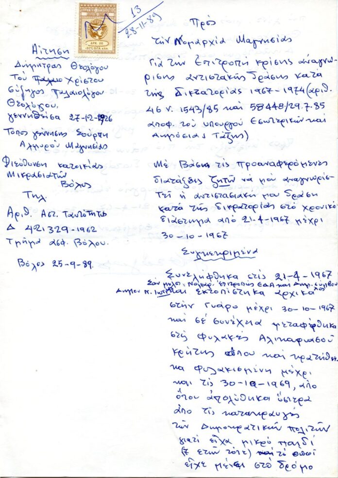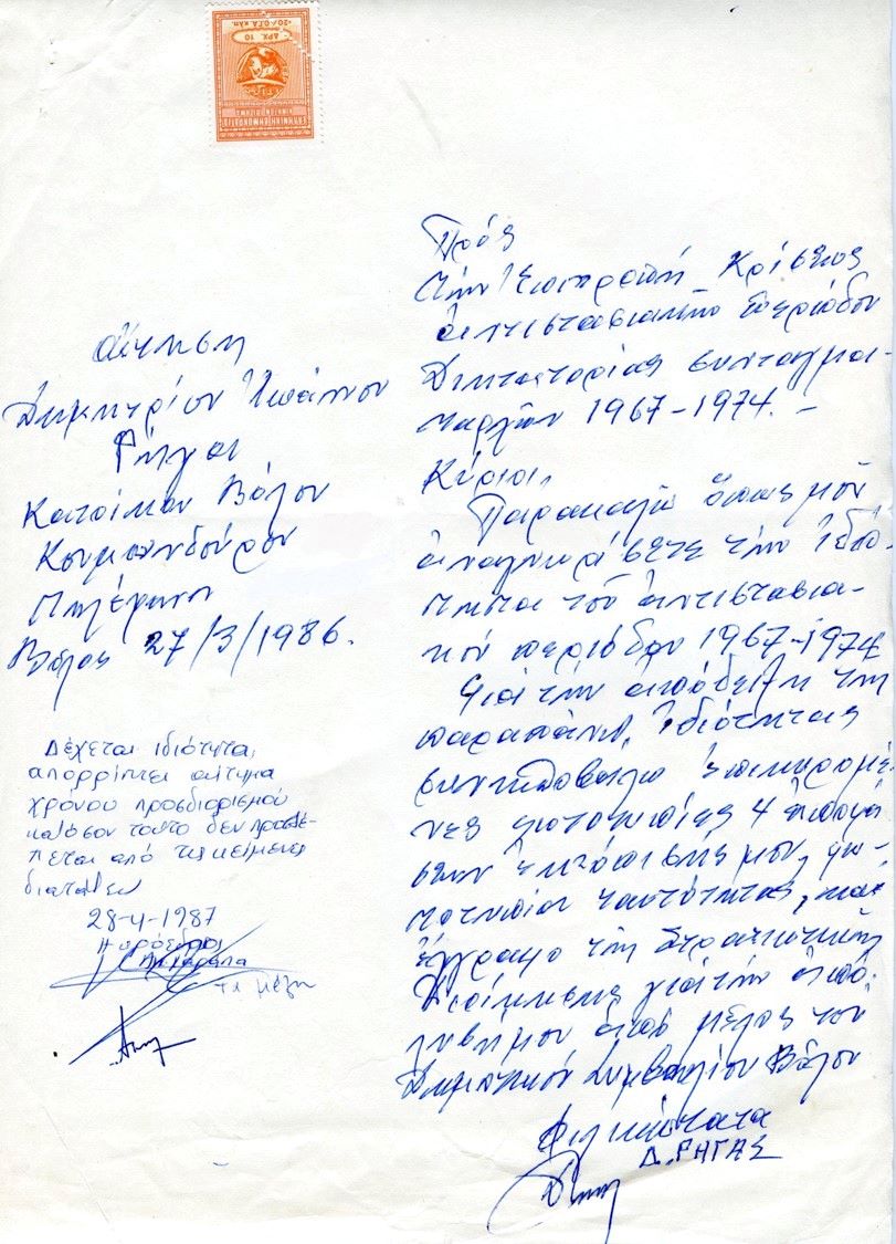 Το 1985 με τον νόμο 1543 αναγνωρίστηκε «η αντίσταση κατά του δικτατορικού καθεστώτος στην Ελλάδα και το εξωτερικό σαν υπηρεσία υπέρ της πατρίδας και του δημοκρατικού πολιτεύματος». Εκτός από τη δράση των διωχθέντων προβλήθηκε η συνταξιοδότηση ή ο υπολογισμός του χρόνου εξορίας τους ως συντάξιμου. Στις νομαρχίες κατά τόπους συστάθηκαν «Επιτροπές Κρίσης Αντιστασιακής Ιδιότητας 1967-1974», στις υποβάλλονταν τα δικαιολογητικά για την αναγνώριση της αντιστασιακής δράσης.