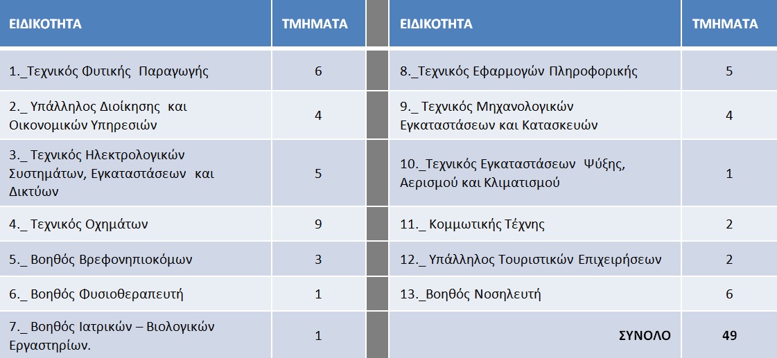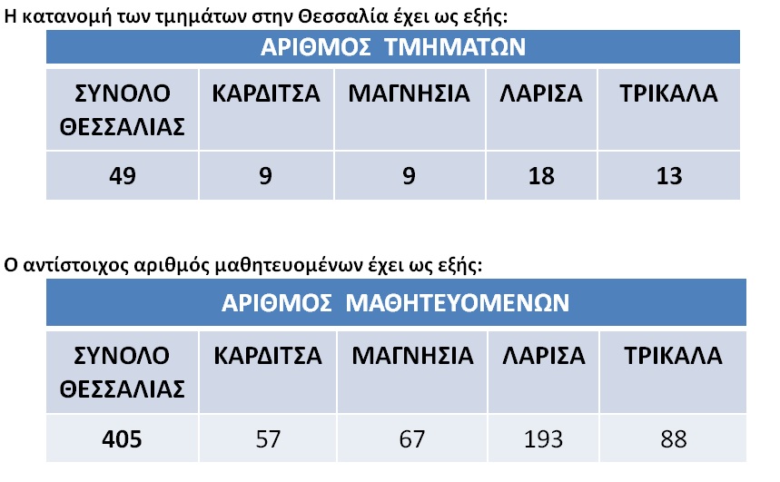 Για την Δ’ Φάση υλοποίησης του «Μεταλυκειακού Έτους – Τάξη Μαθητείας» αποφοίτων ΕΠΑ.Λ. στην περιφέρεια Θεσσαλίας λειτουργούν 49 τμήματα μαθητείας σε σύνολο 18 σχολικών μονάδων, όπως φαίνεται στον παρακάτω πίνακα.