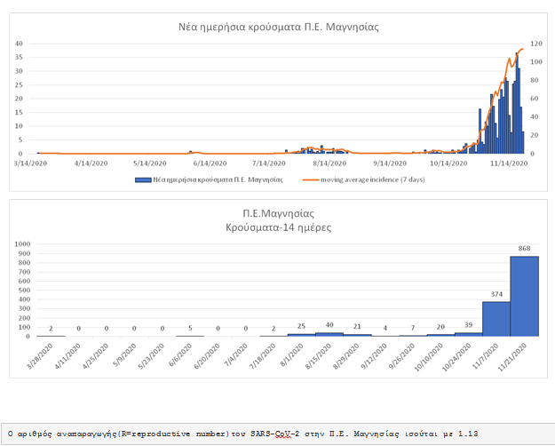 Πιο συγκεκριμένα παρατηρήθηκε αύξηση του αριθμού των κρουσμάτων σε όλες τις Περιφερειακές Ενότητες της Θεσσαλίας. Ο αριθμός αναπαραγωγής (R=reproductive number) του SARS-CoV-2 στην Περιφέρεια Θεσσαλίας για την 9η Νοεμβρίου εκτιμήθηκε γύρω από τη μονάδα και μη στατιστικά σημαντικός (0.99).