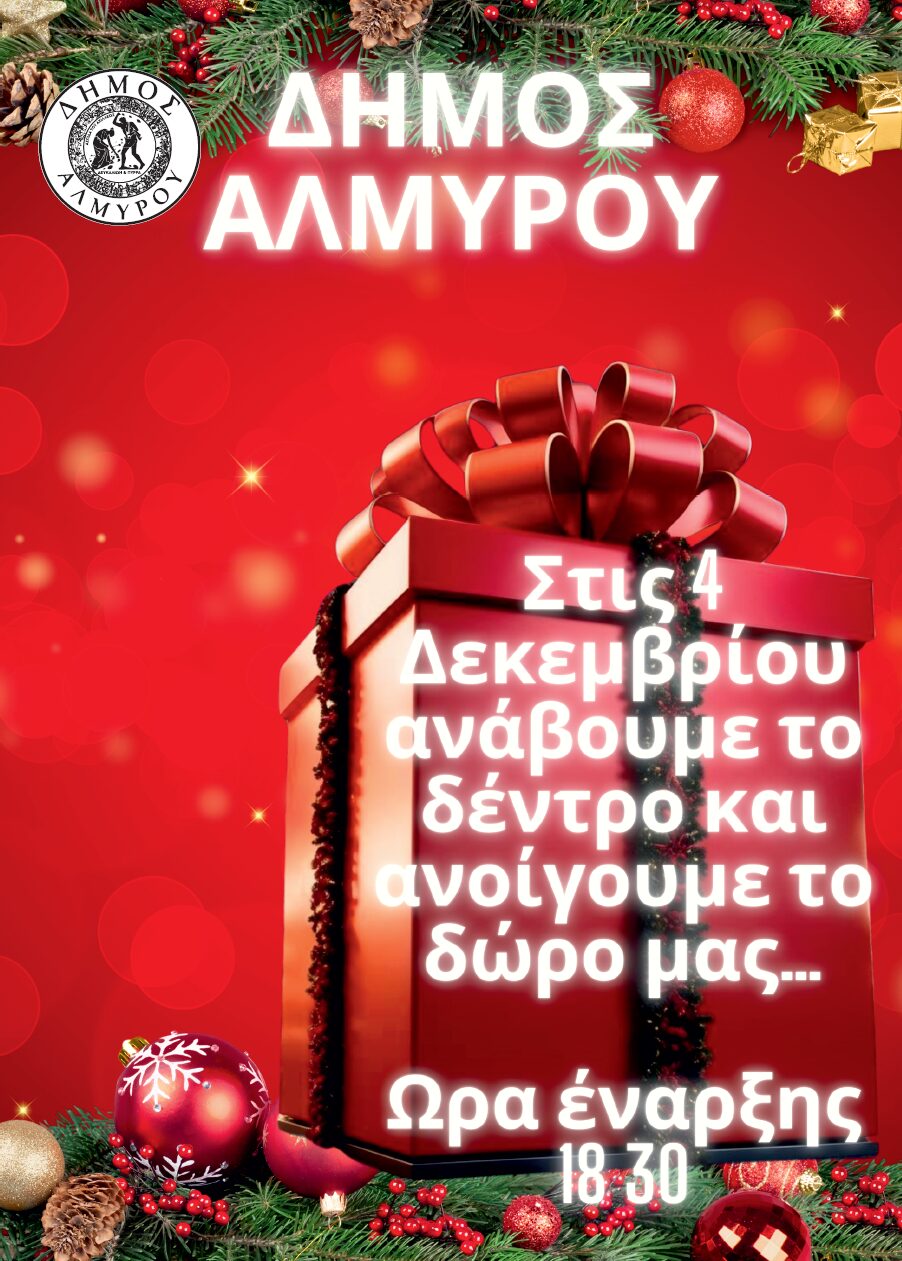 Το άναμμα του Χριστουγεννιάτικου δέντρου θα γίνει στην Κεντρική Πλατεία του Αλμυρού στις 6.30μμ, σε συνεργασία με την Ένωση Εμπορικού και Επιχειρηματικού Συλλόγου Αλμυρού. Οι παρευρισκόμενοι θα παρακολουθήσουν ένα πλούσιο μουσικό πρόγραμμα με την Νεανική – Παιδική χορωδία, τη Μικτή Τετράφωνη Χορωδία και το Φωνητικό Σύνολο του Δημοτικού Ωδείου Αλμυρού, υπό τη διεύθυνση της μαέστρου Μαριάννας Σαμαρτζή. Ο Δήμαρχος Αλμυρού Δημήτριος Εσερίδης θα φωταγωγήσει το δένδρο και θα ανοίξει το Δώρο.