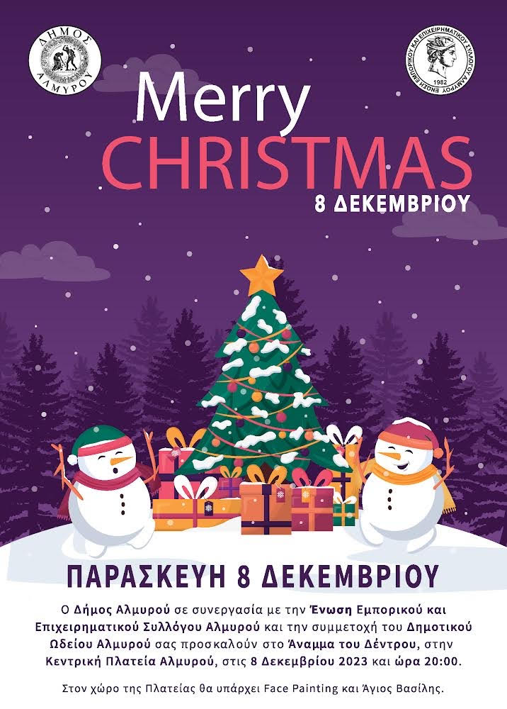 Ο Δήμος Αλμυρού σε συνεργασία με την Ένωση Εμπορικού και Επιχειρηματικού Συλλόγου Αλμυρού και τη συμμετοχή του Δημοτικού Ωδείου Αλμυρού θα πραγματοποιήσουν εκδήλωση για το άναμμα του χριστουγεννιάτικου δέντρου στην Κεντρική Πλατεία Αλμυρού την Παρασκευή 8 Δεκεμβρίου στις 20:00.