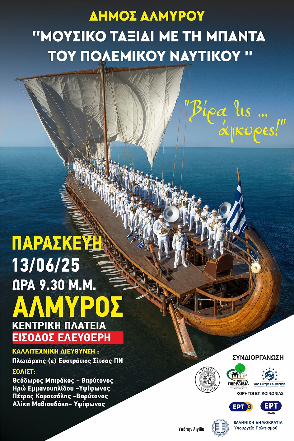 Μια μαγική βραδιά θα ζήσει ο Αλμυρός, που θα είναι φέτος ο απόλυτος προορισμός στη Θεσσαλία για τις καλοκαιρινές συναυλίες. Η περίφημη μπάντα του Πολεμικού Ναυτικού, θα κάνει «απόβαση» στην πόλη για πρώτη φορά, με τους καλύτερους μουσικούς και σολίστες της, την Παρασκευή 13 Ιουνίου και ώρα 9.30μμ το βράδυ, στην κεντρική πλατεία της πόλης, με ελεύθερη είσοδο για όλους, σε μια ονειρική συναυλία που έχει τίτλο «Βίρα τις ..άγκυρες!», με τα ωραιότερα τραγούδια της Ελληνικής και παγκόσμιας μουσικής .