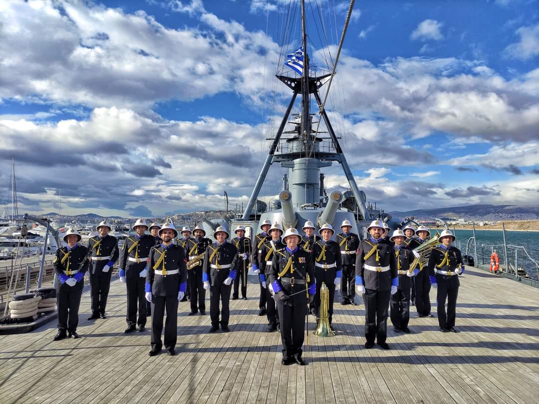 Μουσικοί που επιβαίνουν στο πολεμικό πλοίο «ΕΛΛΑΣ» πραγματοποιούν την πρώτη εμφάνιση της Μπάντας