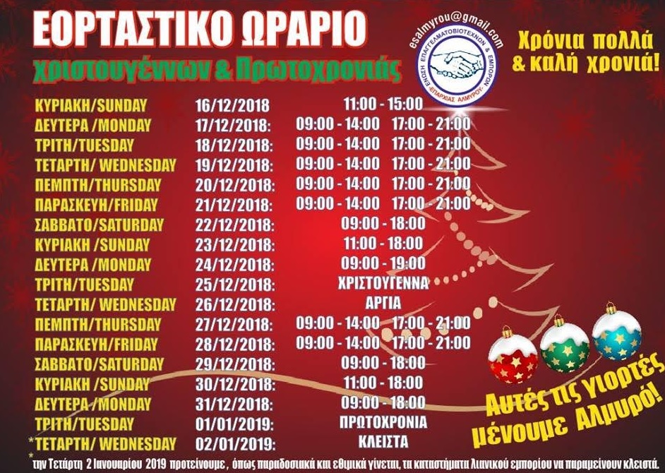 Η Ένωση Επαγγελματιών, Βιοτεχνών και Εμπόρων επαρχίας Αλμυρού, ανακοίνωσε το ωράριο λειτουργίας των καταστημάτων της χριστουγεννιάτικης περιόδου, το οποίο προτείνεται να ακολουθήσουν όλα τα εμπορικά καταστήματα της πόλης και ξεκινά από αύριο Κυριακή 16 Δεκεμβρίου. Πιο συγκεκριμένα, το ωράριο είναι το εξής: