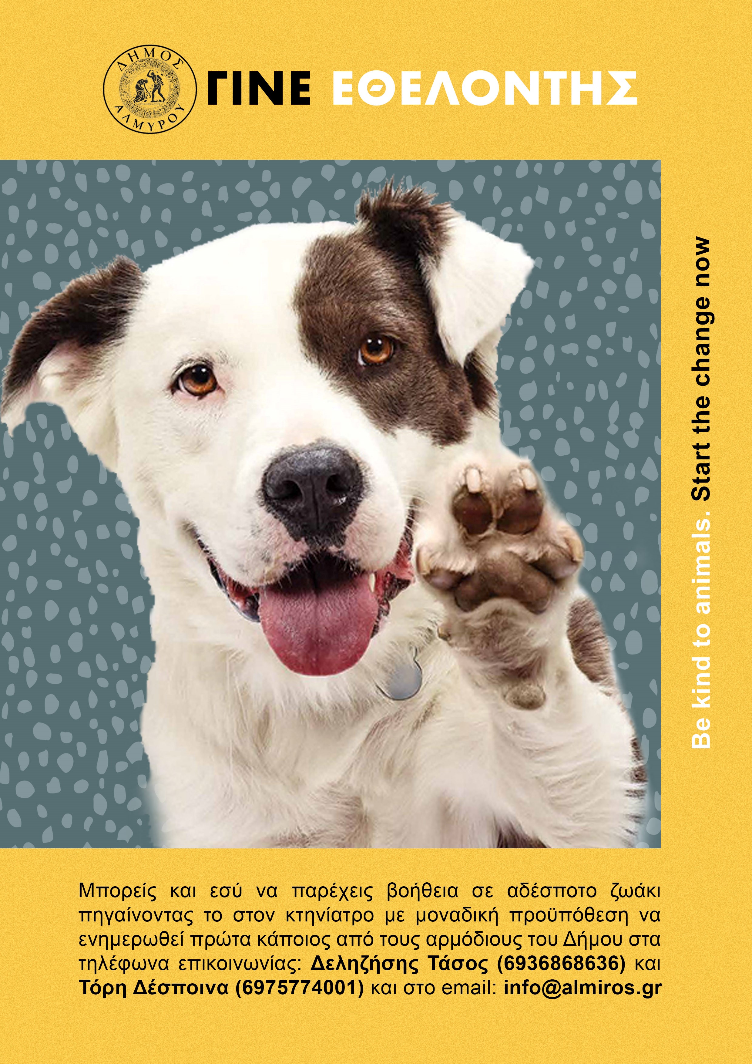 Με σεβασμό στους συμπολίτες αλλά στα ζώα συντροφιάς, που χωρίς δική τους υπαιτιότητα, βρίσκονται στους δρόμους της πόλης, ο Δήμος ανακοινώνει την πρωτοβουλία Δημιουργίας Μητρώου Εθελοντών για την Υποστήριξη του Προγράμματος Διαχείρισης των Αδέσποτων Ζώων Συντροφιάς.