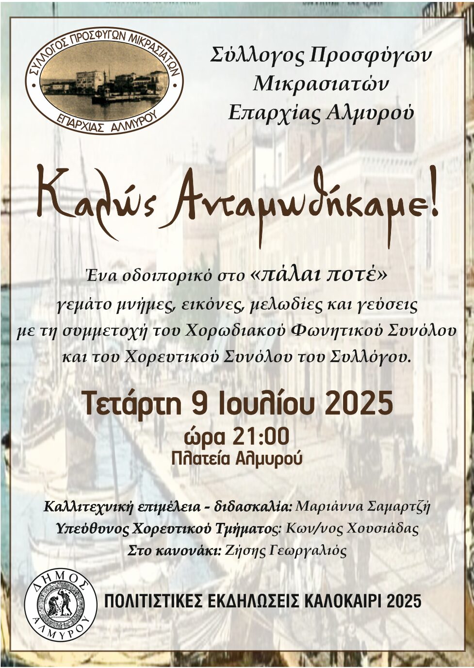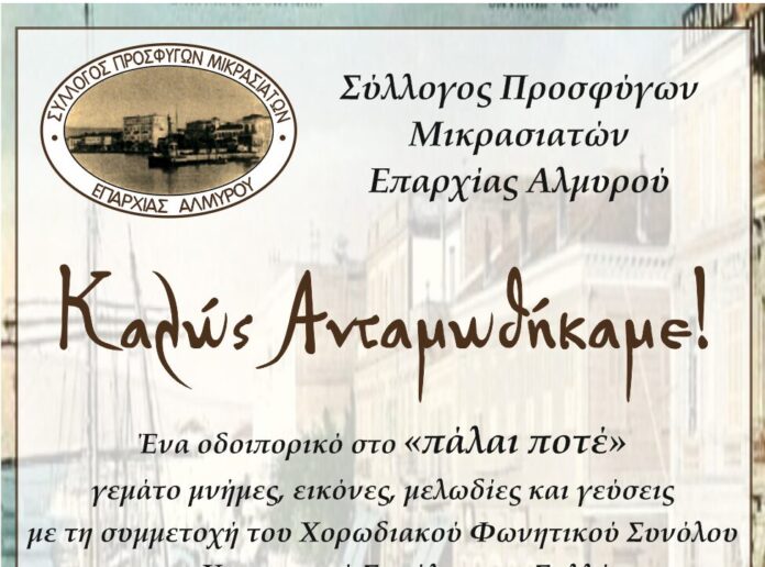 Οδοιπορικό στο “Πάλαι ποτέ” γεμάτο μνήμες, εικόνες, μελωδίες και γεύσεις πραγματοποιείται αύριο, Τετάρτη 9 Ιουλίου στις 21:00 στην Κεντρική Πλατεία Αλμυρού από τον Σύλλογο Προσφύγων Μικρασιατών Επαρχίας Αλμυρού, με τη συμμετοχή του Χορωδιακού Φωνητικού Συνόλου και του Χορευτικού Συνόλου του Συλλόγου.