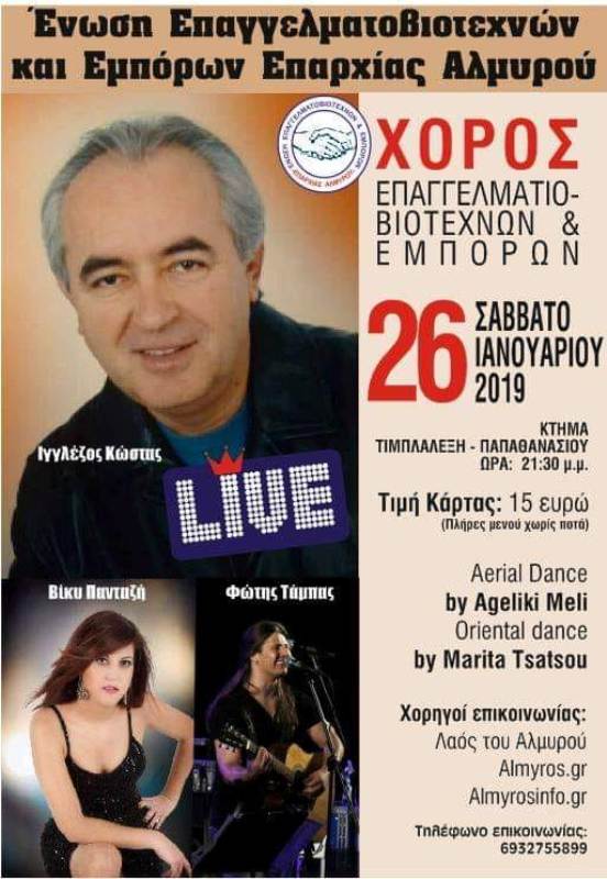 Το Σάββατο 26 Ιανουαρίου και ώρα 21:30 θα πραγματοποιηθεί η κοπή πίτας της Ένωσης Επαγγελματοβιοτεχνών και Εμπόρων Επαρχίας Αλμυρού στο Κτήμα Παπαθανασίου – Τιμπλαλέξη με τον Κώστα Ιγγλέζο και τον Φώτη Τάμπα.