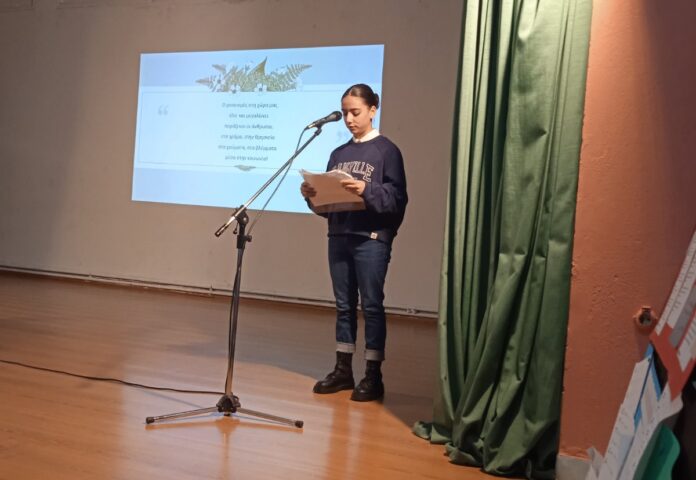Οι μαθήτριες του Σχολείου, Άννα Χάλαρη (Γ΄ Γυμνασίου), Αγάπη Τσιγάνη (Α΄ Γυμνασίου) και Θεοδώρα Χάλαρη (Α΄ Γυμνασίου) παρουσίασαν τις πρωτότυπες ποιητικές δημιουργίες τους στην αίθουσα εκδηλώσεων του 1ου Πειραματικού Γυμνασίου και Λυκείου Νέας Ιωνίας. Στην εκδήλωση συμμετείχαν μαθητές Λυκείων και Γυμνασίων του Βόλου οι οποίοι παρουσίασαν τις ατομικές και συλλογικές εργασίες τους. Η εκδήλωση δεν είχε διαγωνισματικό χαρακτήρα. Οι μαθητές απόλαυσαν το ταξίδι στον κόσμο της ποίησης και τη μοναδική εμπειρία που έζησαν. Υπεύθυνοι και συνοδοί καθηγητές οι κ.κ. Ελένη Τσιαμανή και Γιώργος Τζαφλέρης.