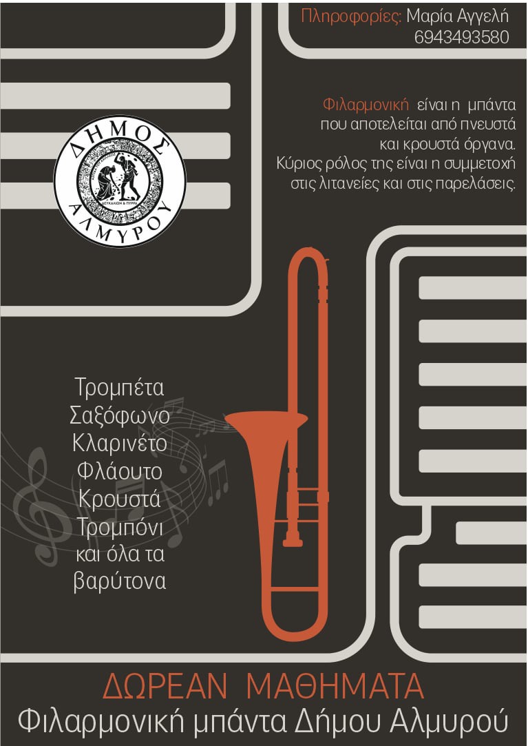 Ανασυστάθηκε και επαναλειτουργεί η Φιλαρμονική του δήμου Αλμυρού, έπειτα από απουσία χρόνων, για να συντροφεύει τις επετείους, τις παρελάσεις και τις λιτανείες, τις γιορτινές και επίσημες ημέρες των Αλμυριωτών, όπως κάνει γνωστό με ανακοίνωσή του ο Δήμος Αλμυρού, επισημαίνοντας ότι ήταν η εξέλιξη αυτή ήταν μία δέσμευση της δημοτικής αρχής.