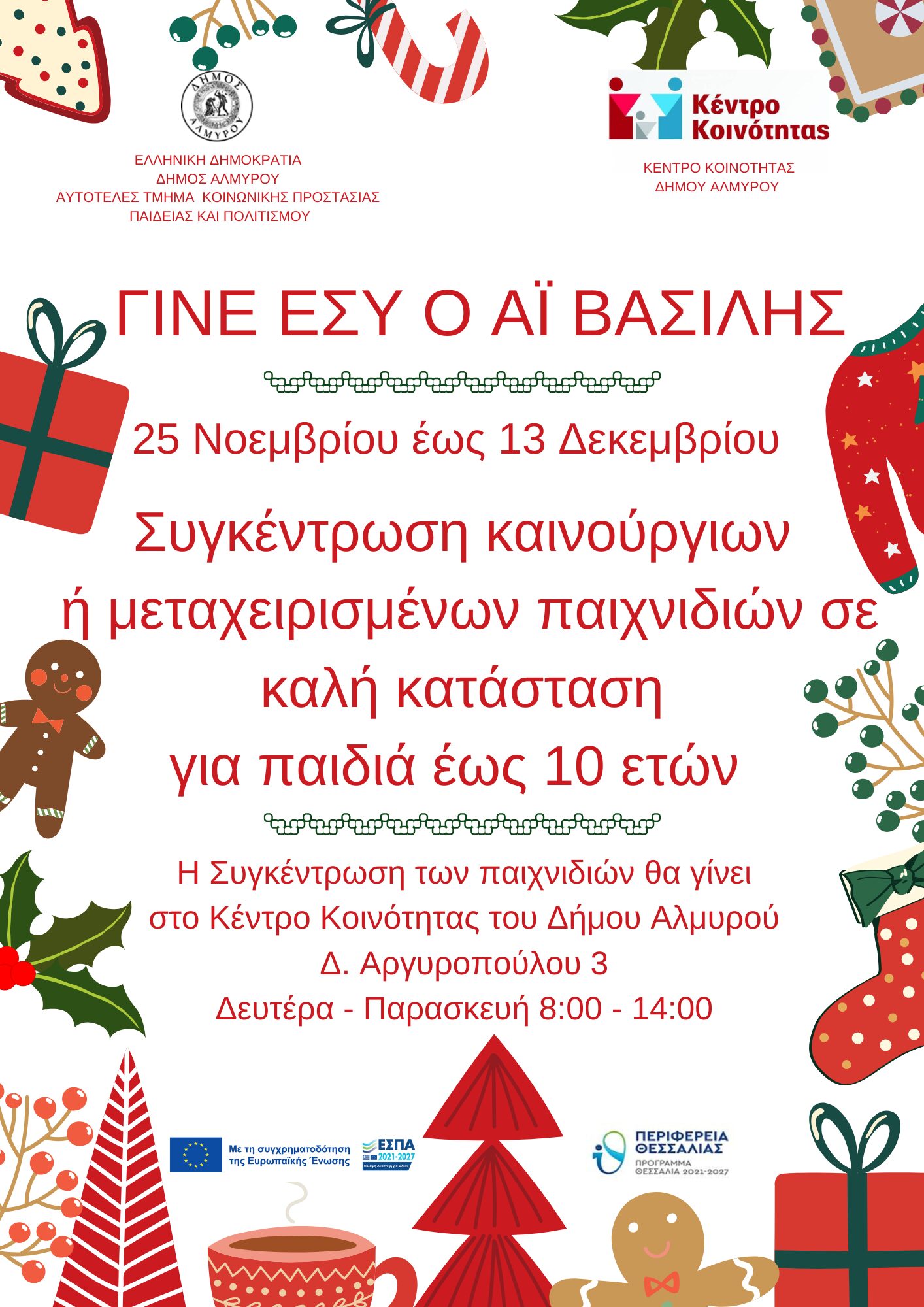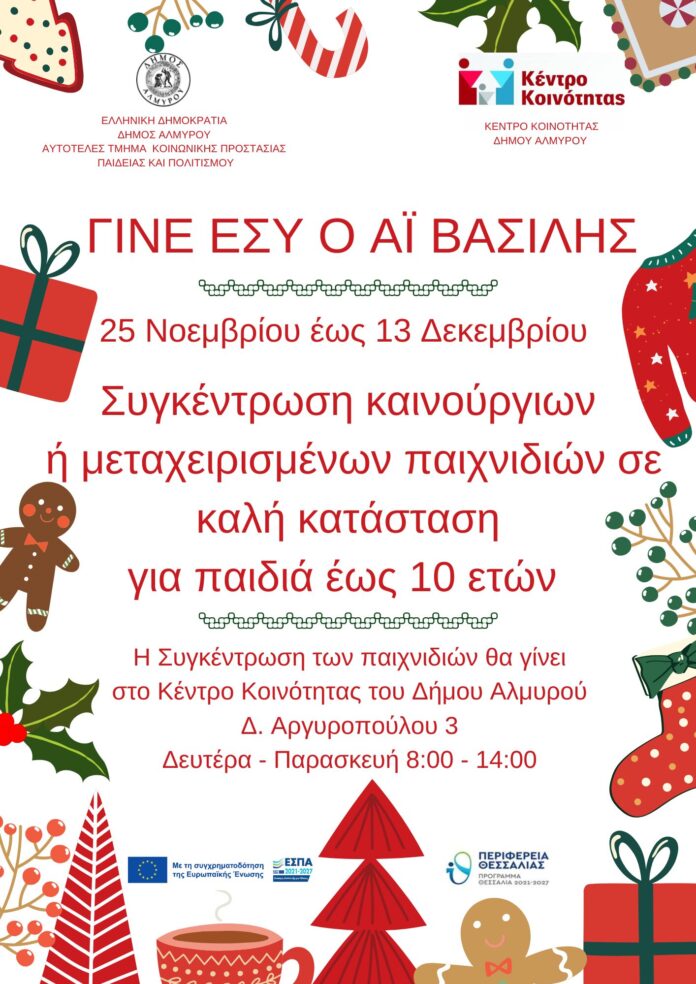 Το Κέντρο Κοινότητας του Δήμου Αλμυρού με γνώμονα τις αξίες της προσφοράς και της αλληλεγγύης, καλεί όσους δημότες επιθυμούν να γίνουν Αϊ Βασίληδες για παιδιά ευάλωτων οικογενειών του Δήμου Αλμυρού.