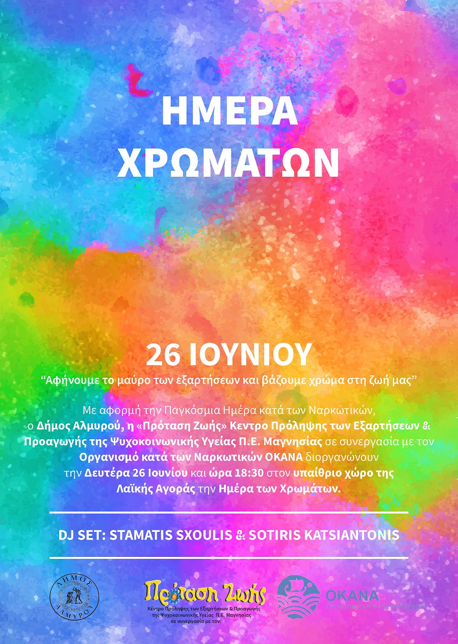 Με αφορμή την Παγκόσμια Ημέρα κατά των Ναρκωτικών και της Διακίνησής τους, ο Δήμος Αλμυρού συνεργάζεται ξανά με το Κέντρο Πρόληψης των Εξαρτήσεων και Προαγωγής της Ψυχοκοινωνικής Υγείας Π.Ε. Μαγνησίας «Πρόταση Ζωής» και τον Οργανισμό Κατά των Ναρκωτικών (ΟΚΑΝΑ) και δημιουργούν την Ημέρα των Χρωμάτων.