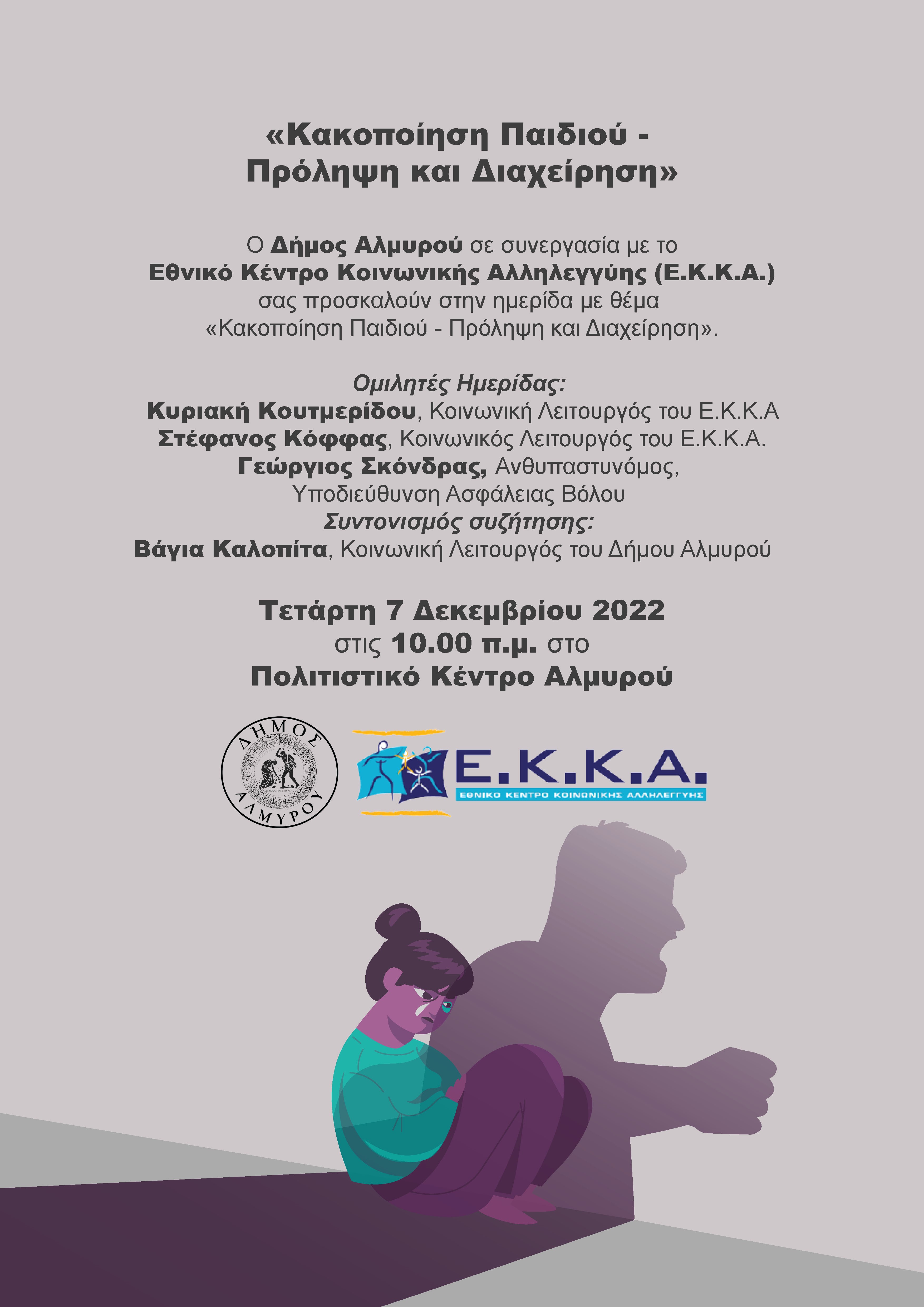Ο Δήμος Αλμυρού σε συνεργασία με το Εθνικό Κέντρο Κοινωνικής Αλληλεγγύης πραγματοποιούν ημερίδα με θέμα “Κακοποίηση Παιδιού- Πρόληψη και Διαχείριση», την Τετάρτη 7 Δεκεμβρίου στις 10 το πρωί στο Πολιτιστικό Κέντρο Αλμυρού.