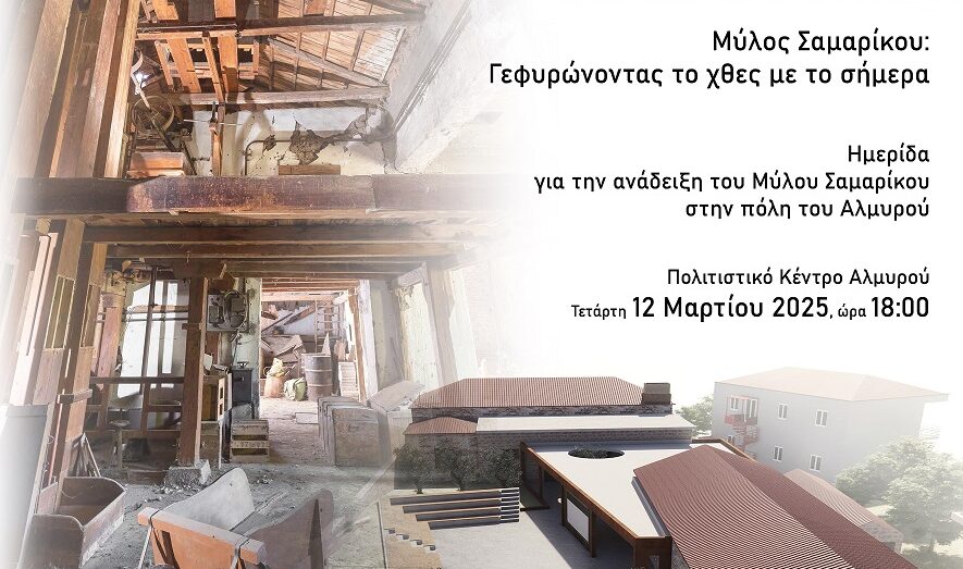 Ο Δήμος Αλμυρού, σε συνεργασία με το Τμήμα Αρχιτεκτόνων Μηχανικών του Πανεπιστημίου Θεσσαλίας, την Εφορεία Αρχαιοτήτων Μαγνησίας και τη Φιλάρχαιο Εταιρεία Αλμυρού «Όθρυς», διοργανώνουν ημερίδα για την προβολή και ανάδειξη του Μύλου Σαμαρίκου στην πόλη του Αλμυρού, με θέμα: «Μύλος Σαμαρίκου: Γεφυρώνοντας το χθες με το σήμερα». Η ημερίδα θα πραγματοποιηθεί την Τετάρτη 12 Μαρτίου 2025 στο Πολιτιστικό Κέντρο του Δήμου Αλμυρού.