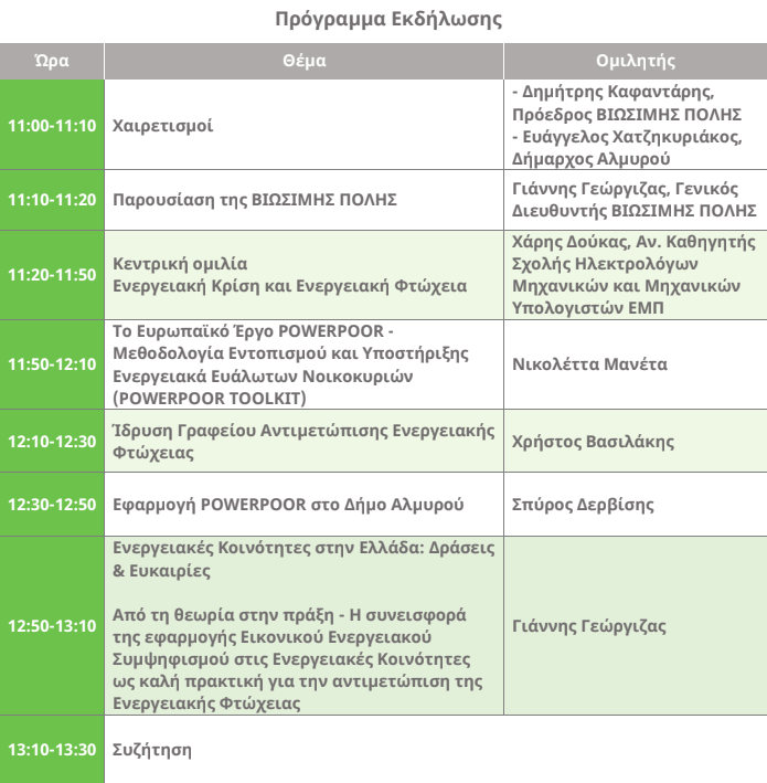 O Δήμος Αλμυρού θα πραγματοποιήσει από κοινού με το Δίκτυο Πόλεων «Βιώσιμη Πόλη» ημερίδα με τίτλο «Καταπολεμώντας την ενεργειακή φτώχεια – Το Ευρωπαϊκό Έργο POWERPOOR», την Πέμπτη 8 Δεκεμβρίου και ώρα 11:00 π.μ., στην Αίθουσα Πολιτιστικού Κέντρου Δήμου Αλμυρού (Αθήνας 1, Αλμυρός, 37100).