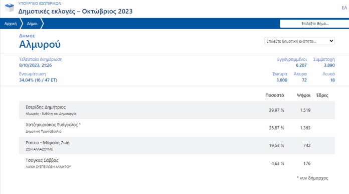Με την καταμέτρηση να έχει ολοκληρωθεί σε 16 από τα 47 τμήματα του δήμου Αλμυρού, ο Δημήτρης Εσερίδης προηγείται με 39,97% έναντι του Βαγγέλη Χατζηκυριάκου που έχει μέχρι στιγμής ποσοστό 35,87%.