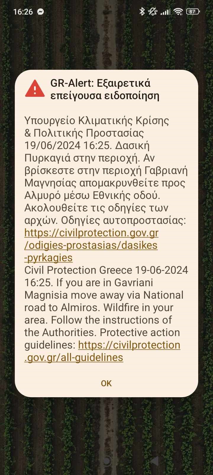 Στο μεταξύ εντολή εκκένωσης έδωσε ο Δήμαρχος Αλμυρού για την περιοχή της Γάβριανης. Όπως αναφέρει ο δήμαρχος αποφασίζουμε την οργανωμένη απομάκρυνση όλου του πληθυσμού που βρίσκεται στον Οικισμό Γαύριανη της Δ.Κ. Πτελεού προς την ΠΑΘΕ (Εθνική οδό) για λόγους προστασίας της ζωής και της υγείας των ατόμων που βρίσκονται σε αυτήν από την εκδήλωση της πολύ επικίνδυνης δασικής πυρκαγιάς.