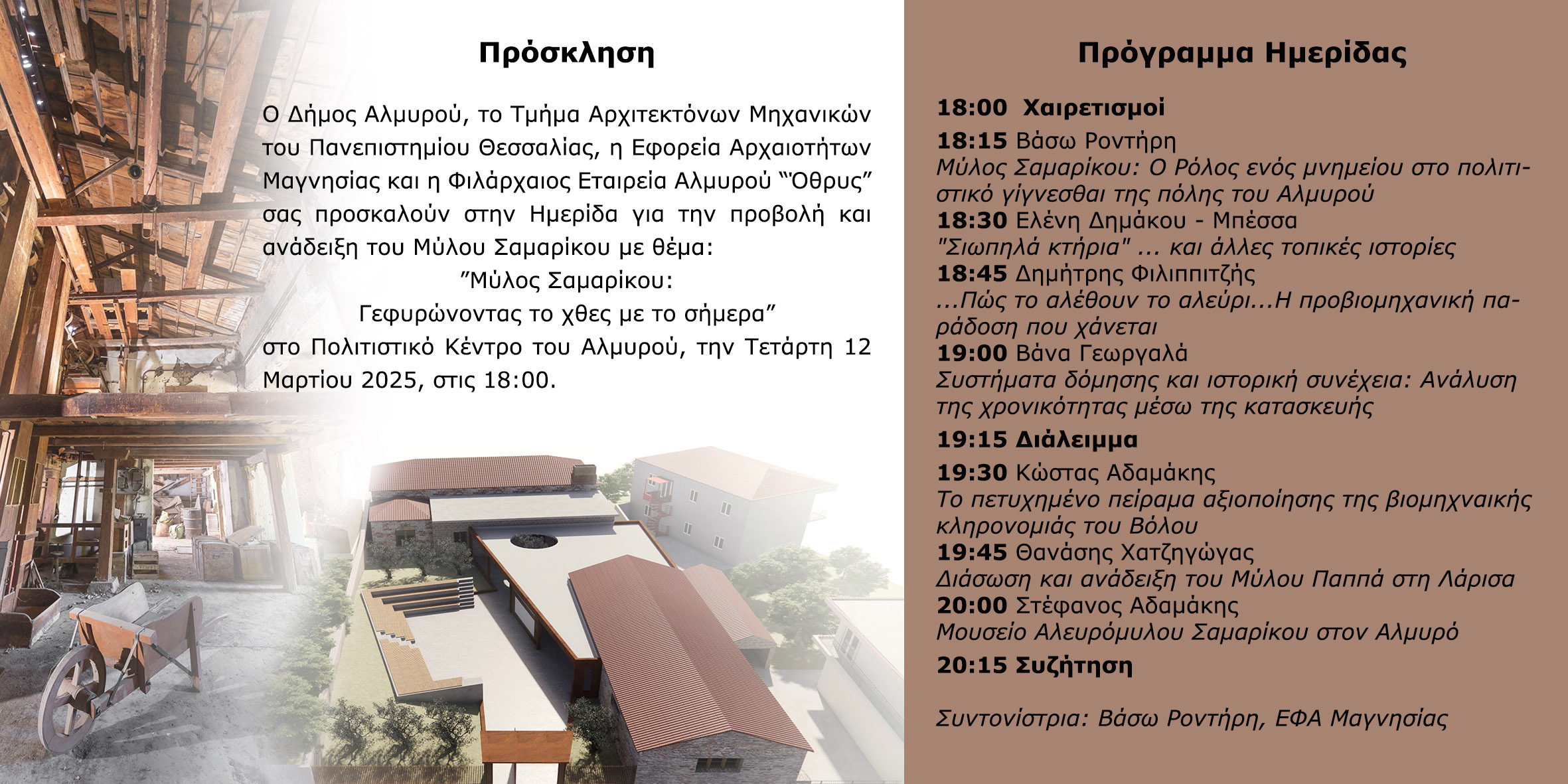 Ο Δήμος Αλμυρού, σε συνεργασία με το Τμήμα Αρχιτεκτόνων Μηχανικών του Πανεπιστημίου Θεσσαλίας, την Εφορεία Αρχαιοτήτων Μαγνησίας και τη Φιλάρχαιο Εταιρεία Αλμυρού «Όθρυς», διοργανώνουν Ημερίδα για την προβολή και ανάδειξη του Μύλου Σαμαρίκου στην πόλη του Αλμυρού, με θέμα: «Μύλος Σαμαρίκου: Γεφυρώνοντας το χθες με το σήμερα» θα πραγματοποιηθεί την Τετάρτη 12 Μαρτίου στις 18:00 στο Πολιτιστικό Κέντρο του Δήμου Αλμυρού.
